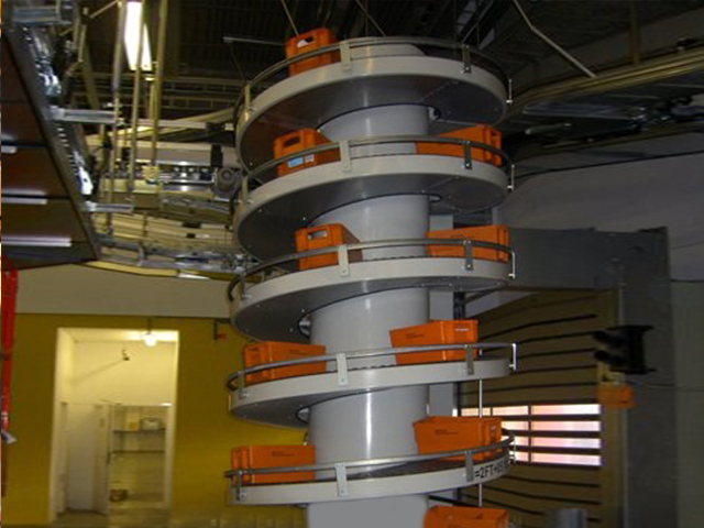 New concept of manpower save The Loknath Spiral Conveyors represented concept in India vertical conveying Systems, based on a proprietary low friction chain and slat arrangement. The Loknath Spirals are attractive because they have a higher throughput capacity, require less space, generate noise less, consume less energy, cost competitive to install, and less maintenance and have a longer life compared to conventional methods. The spiral conveyors are also known as spiral or case lifts, spiral elevators, and spiral lower actors.